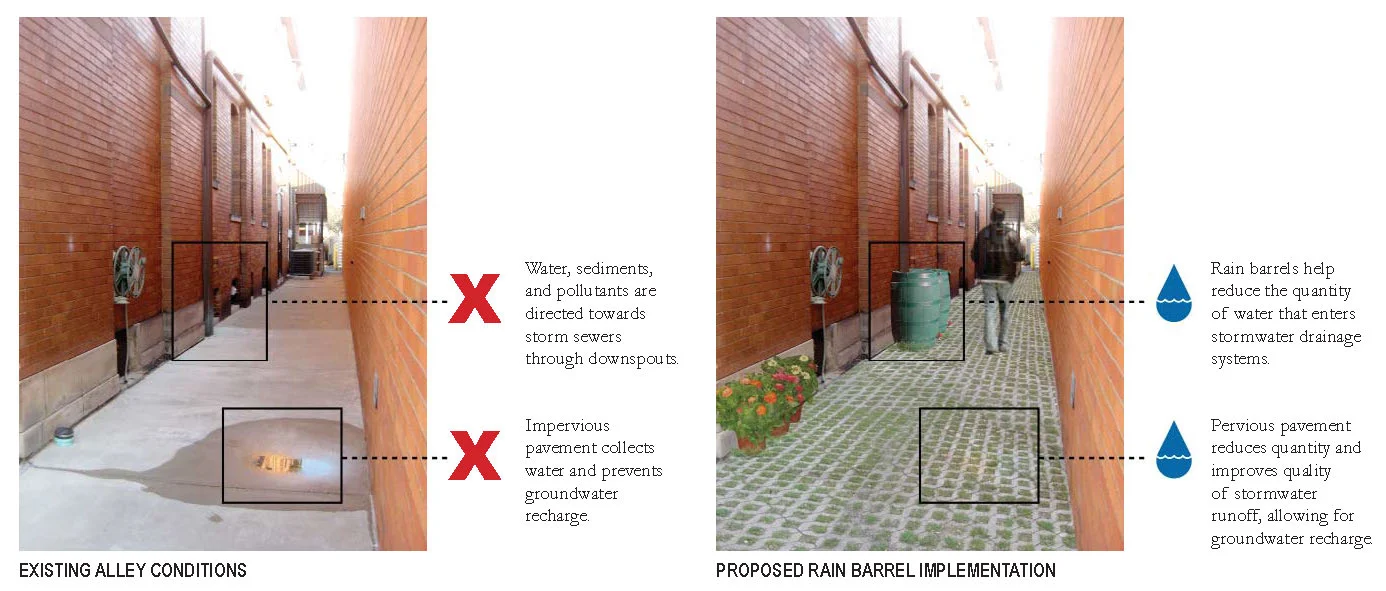 Tasks completed within the project include existing conditions analysis, researching sustainability best practices, and design and development of three-part phasing plans and diagrams.