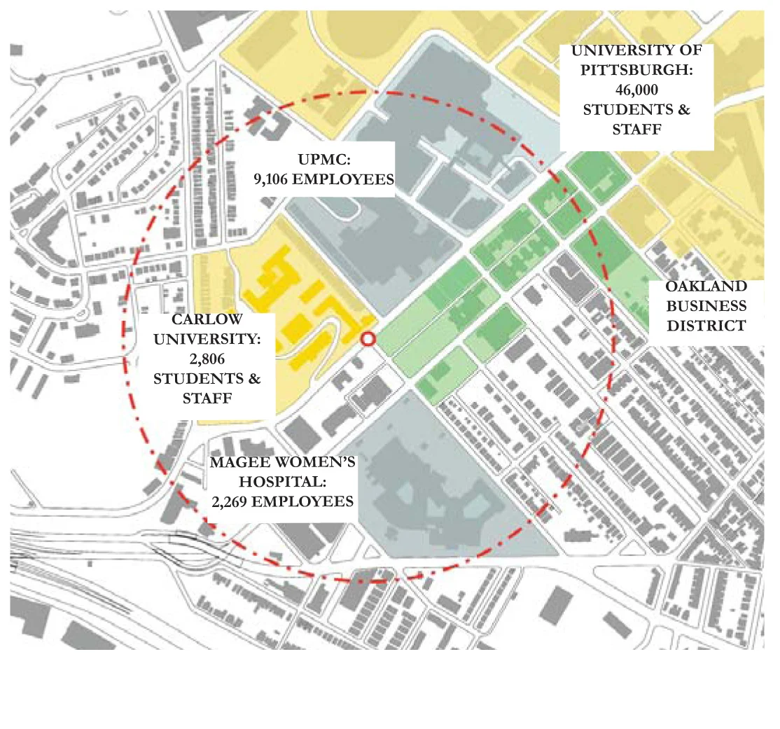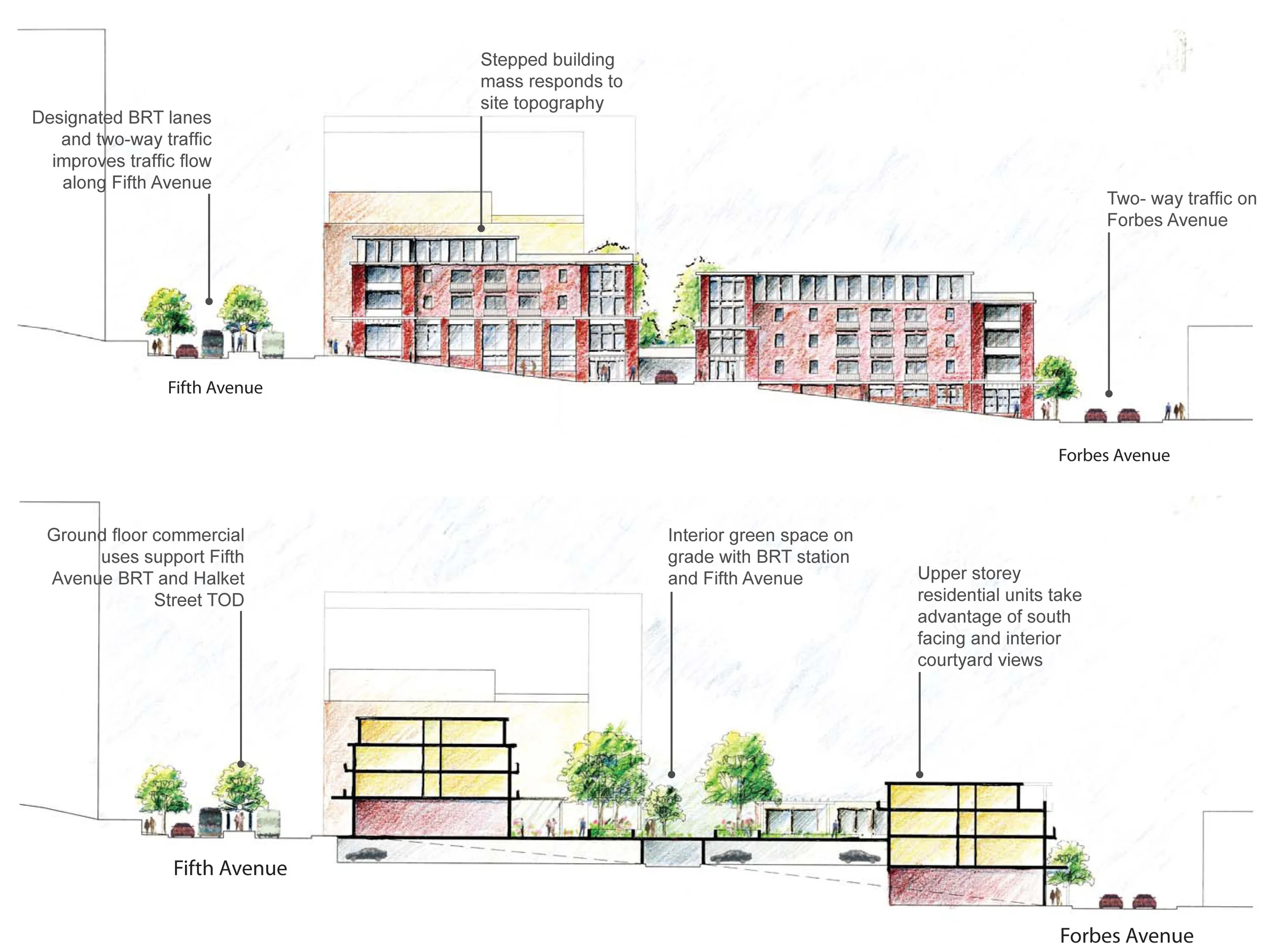 With a strong urban context to build upon, the design of the site took its cues from the massing of adjacent institutional buildings, creating a continuous street edge along Fifth and Forbes Avenues and Halket Street. Adjacent amenities and institutions, south facing exposure, as well as neighborhood connections to the surrounding area influenced the location of commercial, residential, and office uses as well as public open spaces. Furthermore, a change in topography of 25 feet between Fifth And Forbes Avenues allowed for stepping of the building masses, concealment of service functions, and the creation of a public green space that spans the existing alley. Critical to the success of the project is a proposed business center which creates a link between downtown and the institutions of Oakland and Shadyside as well as becomes a destination along the Fifth Avenue Express.
