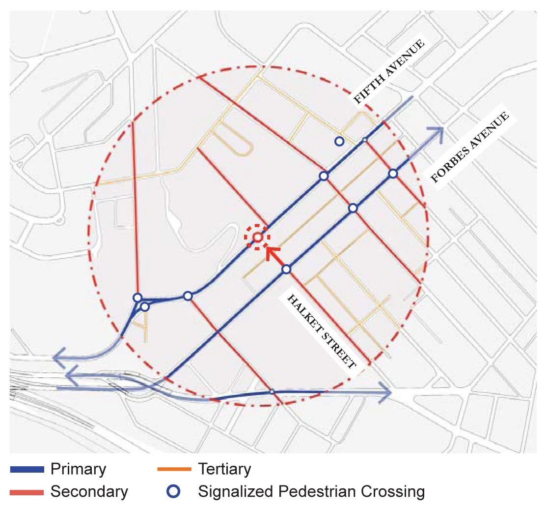 As the second phase of a two-part studio project, the Halket Street transit oriented development explores the possibility urban growth along Pittsburgh’s Fifth Avenue. Located on the block of Halket Street between Fifth and Forbes Avenue in Oakland, this TOD is linked to the future Halket Street stop along the Fifth Avenue corridor, a Buss Rapid Transit (BRT) system developed in the first half of the spring semester and the current focus of the City of Pittsburgh and the Port Authority of Allegheny County. The site was selected based on existing local amenities, institutions, and high number of potential riders who frequent local destinations, employment centers, and residential neighborhoods within a 1/4 mile walk of the transit stop as well as the site’s integration into the Oakland 2025 Plan, a local community development plan for the Oakland neighborhood.