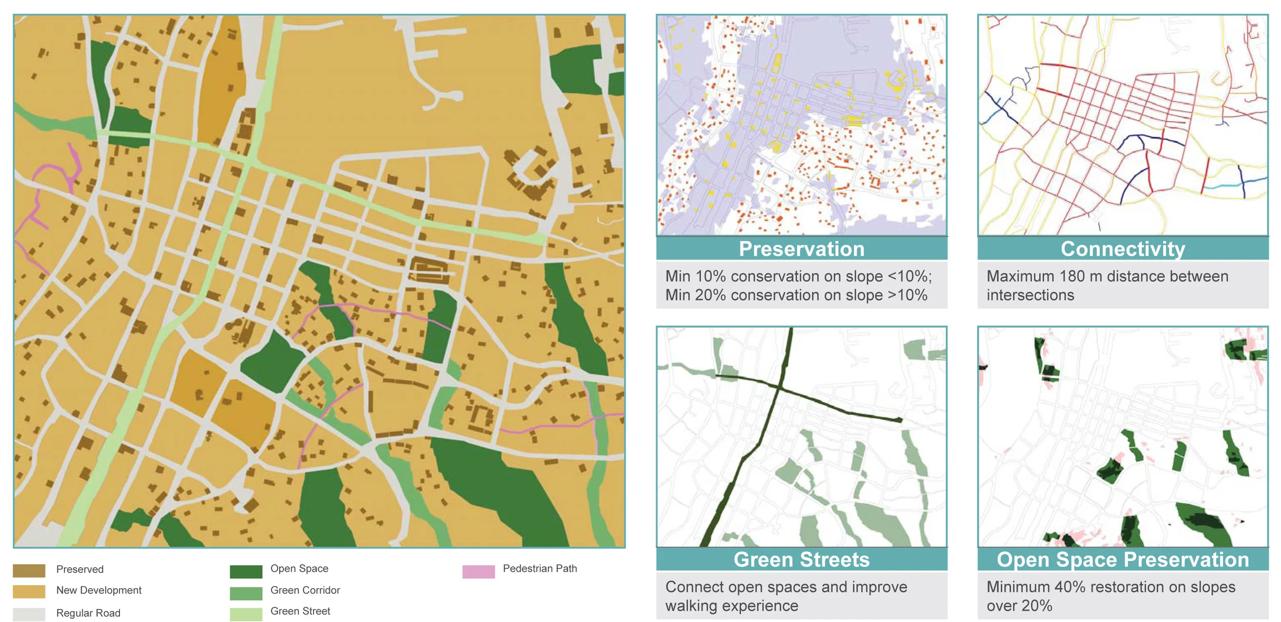 The study began with an audit of existing zoning codes and the City’s comprehensive master plan to determine constraints, opportunities, and goals of the existing planning tools. From here, the studio outlined eight major themes which were commonly found within the master plan documents. With the overarching goals of economy, equity, and ecology as guiding principles, the studio team developed a series of sustainability metrics and recommendations under each of the eight themes to better align design visions and sustainability goals with existing conditions and market demands. These guidelines were based off of current guidelines such as LEED ND and ASLA Sustainable Sites Initiative Guidelines & Performance Benchmarks as well as recommendations developed by the MUD studio based on the studio’s trip to Kigali.