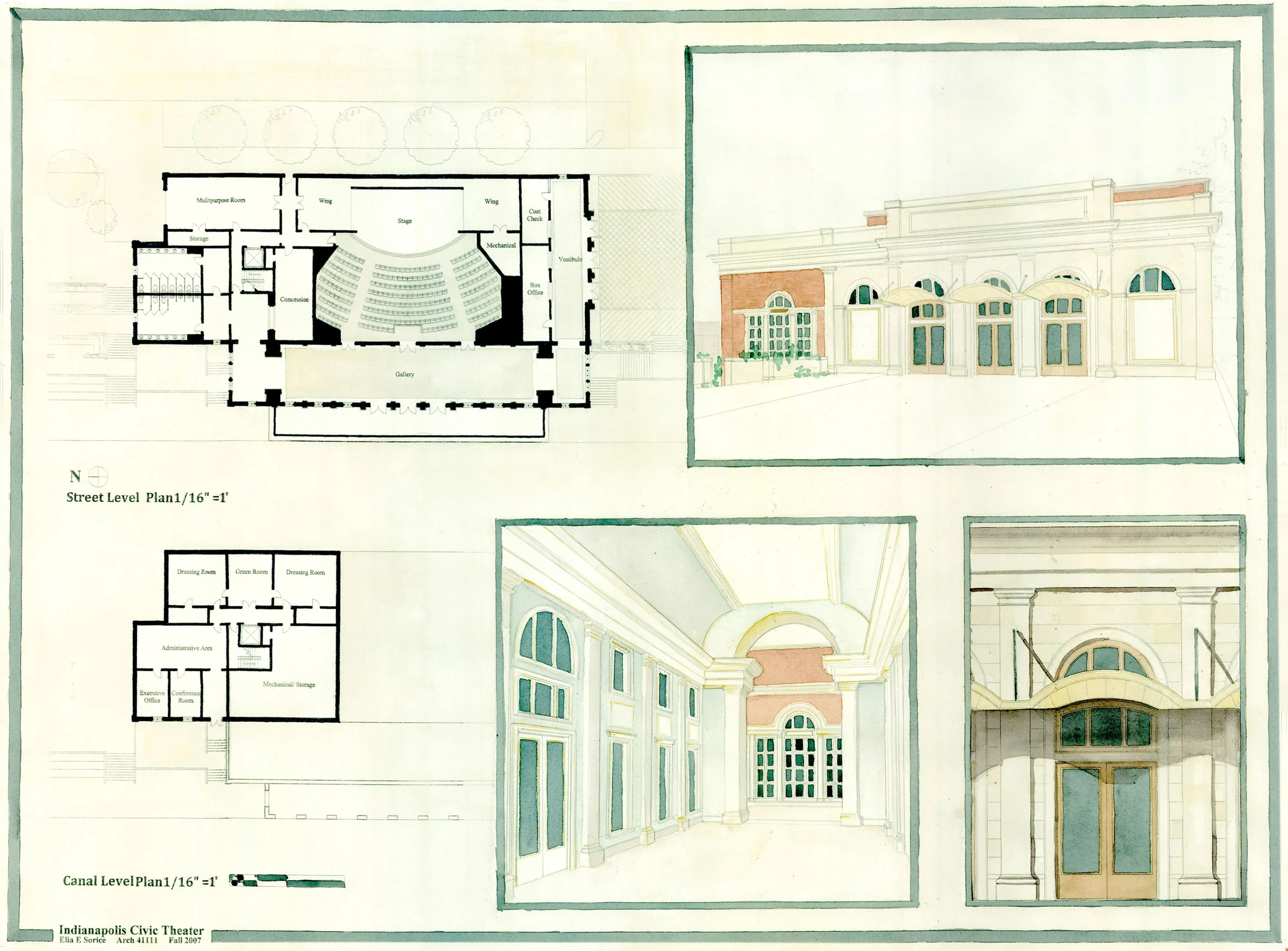 Completed in the fall of 2007, this project explored the design and development of a unique urban block for a 250 seat civic theater in downtown Indianapolis. Situated along the Indianapolis Canal Walk, across the water from the Indiana Historical Society, and adjacent to a city parking garage, the unique size of the site, 400’x80’, and steep slope were perhaps the biggest challenges for this project, providing the opportunity to program interior and exterior spaces while adhering to ADA requirements.